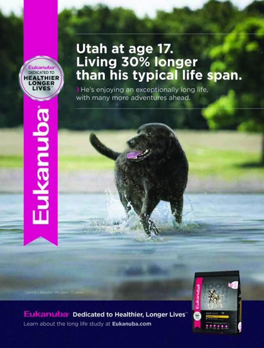 According to the ads, dogs in a 10-year Eukanuba study – including featured canines Bunny, Utah, Georgia, Clown, and Iowa – were “living 30% longer” than their typical life span. What’s more, each was “living an exceptionally long life and still full of vitality” even at age 16 or 17. Other ads touted the “astonishing” observation that with “Eukanuba and proper care,” dogs in the study “were able to live beyond their typical life span.”