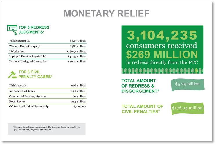 In her statement introducing the Highlights, Acting Chair Maureen Ohlhausen cited the agency’s “robust consumer protection agenda” and the fact that this past year, “the FTC filed or settled 85 consumer protection matters in district court, reached 24 administrative consent agreements related to consumer protection, and distributed over $269 million in redress to over 3 million consumers.”