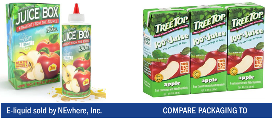 The product on the left is a nicotine-laced liquid for e-cigarettes that can be fatal to kids who ingest as little as a teaspoon. The e-liquid label calls the product a “JUICE BOX,” mimics shelf-stable beverage packaging, and even has an image of one of those little sippy straws on the side of the box. Open it up and it’s apple-scented.