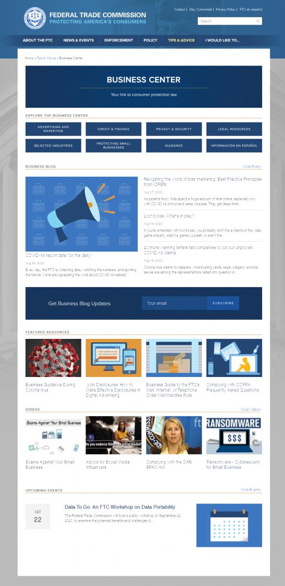 Take a quick look at the BCP Business Center and you’ll see it’s undergone some renovations. Front and center now are direct links to our primary topics: Advertising & Marketing, Credit & Finance, and Privacy & Security. You’ll also have easier access to: