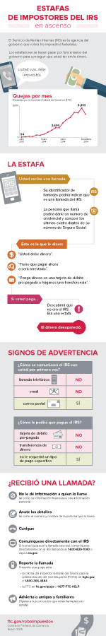 Las estafas de impostores que simulan trabajar para el IRS se aprovechan de la falta de conocimiento de los consumidores respecto del modo en que el IRS se comunica con ellos. El IRS nunca llamará por teléfono a un consumidor para comunicarle el incumplimiento de pago de sus impuestos o la imposición de penalidades – habitualmente, el IRS se comunica con los consumidores a través de una carta. Si los consumidores reciben una supuesta llamada del IRS, jamás deben enviar dinero, porque una vez que se lo envían al delincuente, es imposible recuperarlo. En su lugar, deben colgar el teléfono y reportar la estafa ante la FTC y la oficina del Inspector General del Tesoro para la Administración del Contribuyente en tigta.gov.
