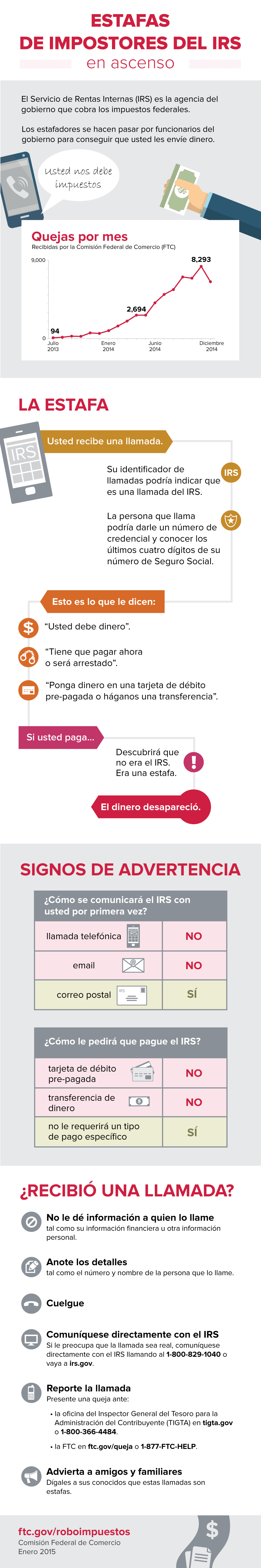 Las estafas de impostores que simulan trabajar para el IRS habitualmente consisten en un individuo que se comunica por teléfono con un consumidor presentándose como un agente del IRS y le dice al consumidor que le debe dinero al IRS. Estas personas que llaman a los consumidores les sugieren que paguen por medio de una transferencia de dinero o cargando dinero a una tarjeta de débito pre-pagada. Estos estafadores suelen amenazar a la gente por teléfono con arrestos o acciones legales, y pueden falsear el origen de sus llamadas para que parezca que están llamando desde un número de teléfono de Washington, D.C.; e incluso es posible que conozcan todo o una parte del número de Seguro Social de un consumidor, dándole credibilidad a la estafa. El incremento de casi veinticuatro veces de las quejas relacionadas con impostores del IRS indica que los estafadores están usando esta técnica contra los consumidores a lo largo y a lo ancho del país.