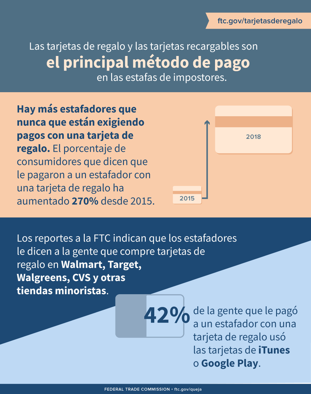 Las tarjetas de regalo son atractivas para los estafadores porque les ofrecen anonimato, y una vez que se usan, es muy difícil revertir la transacción. El consejo de la FTC es simple: Si alguien le dice que le pague con una tarjeta de regalo, no lo haga. Las tarjetas de regalo son para hacer regalos, no para hacer pagos.