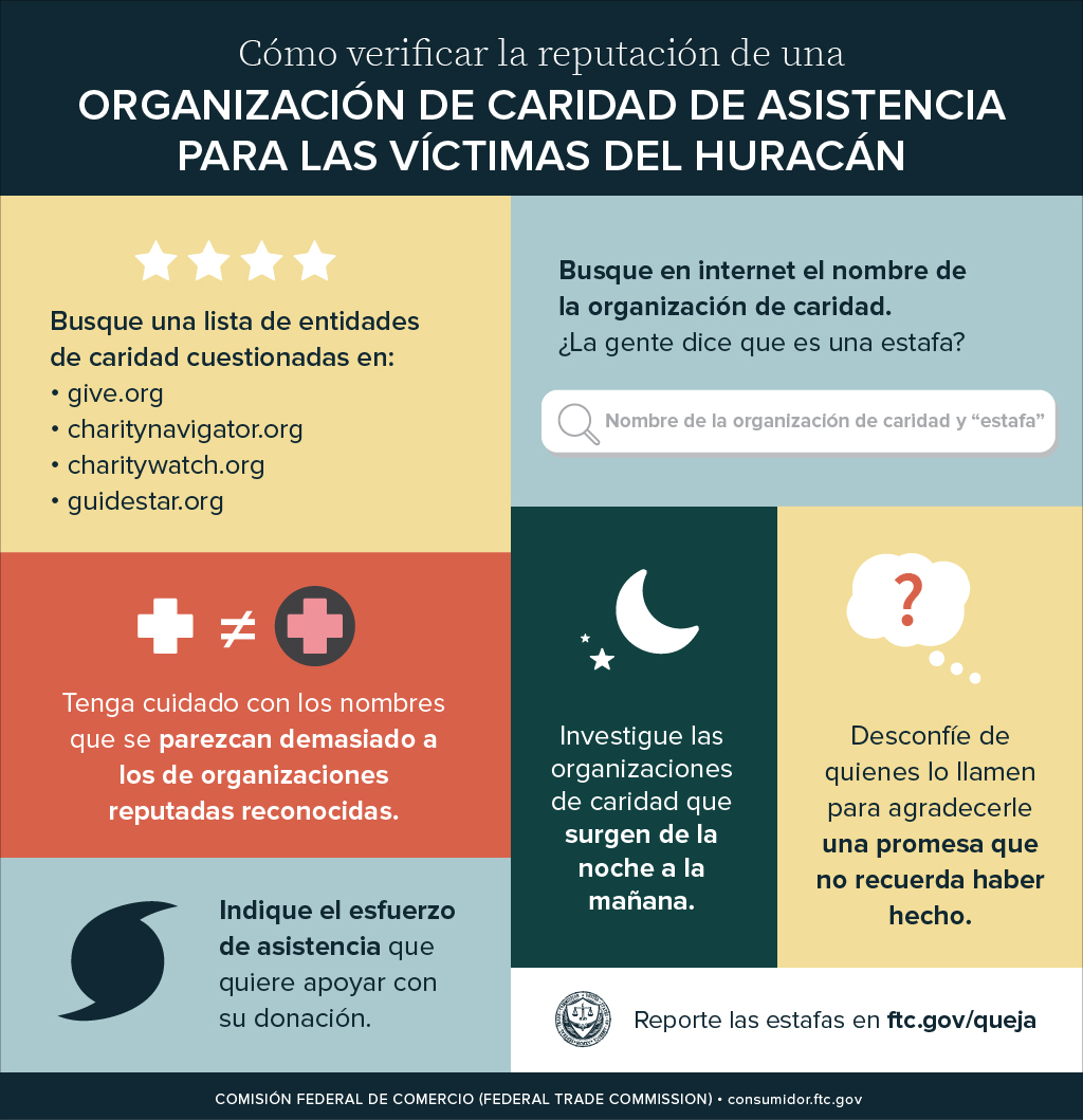 Si quiere donar dinero a una organización de caridad, en el artículo del blog de la FTC Haz valer tus donaciones para las víctimas de los huracanes, se describe lo que puede hacer usted para asegurarse de que su dinero se destine a las causas que desea apoyar. Para consultar un resumen de esta información, vea la infografía Cómo verificar la reputación de una organización de caridad de asistencia para las víctimas.