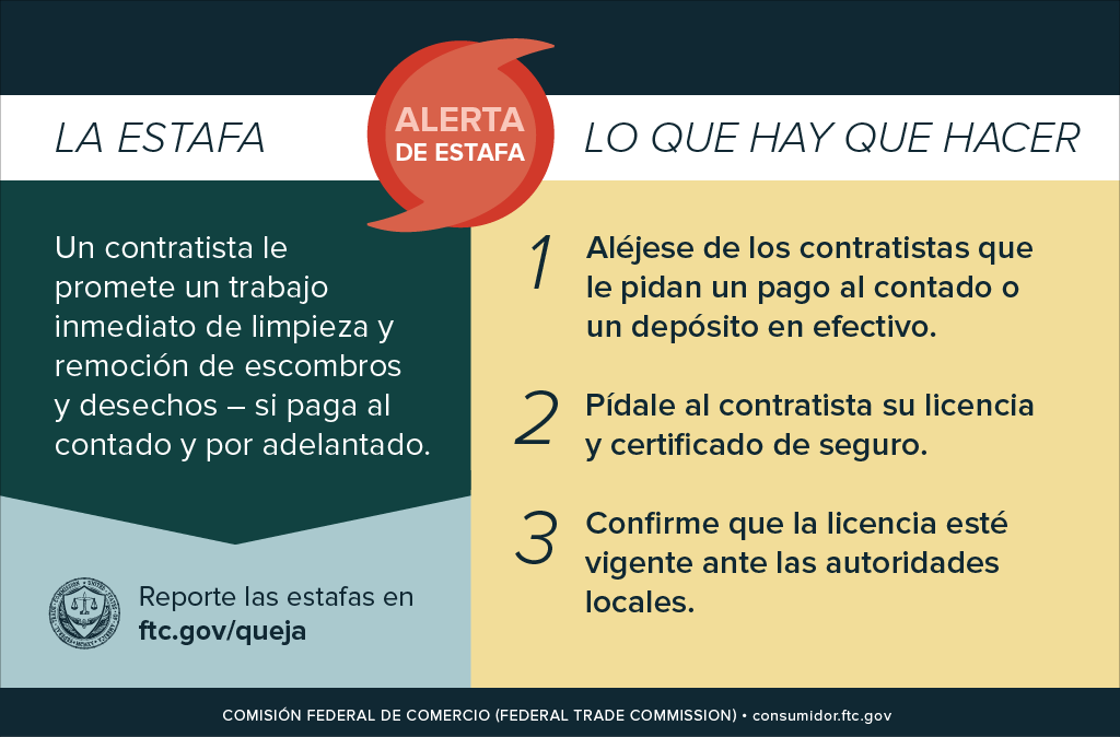 Después de un desastre natural, a menudo suelen aparecer contratistas y estafadores que prometen tareas de limpieza y remoción de escombros, pero algunos de ellos exigen un pago por adelantado por un trabajo que no harán nunca, y otros sencillamente carecen de la experiencia, licencias y seguros necesarios para hacer el trabajo legalmente. El artículo del blog, Evita las estafas de limpieza después de un huracán, contiene recomendaciones para proteger su propiedad, su dinero y a sí mismo. Para consultar un resumen de esta información, vea la infografía: La estafa: Lo que hay que hacer.