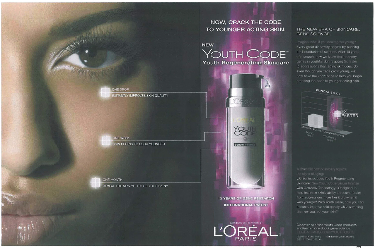 Portion of L’oreal Youth Code print advertisement. (click to view full ad)