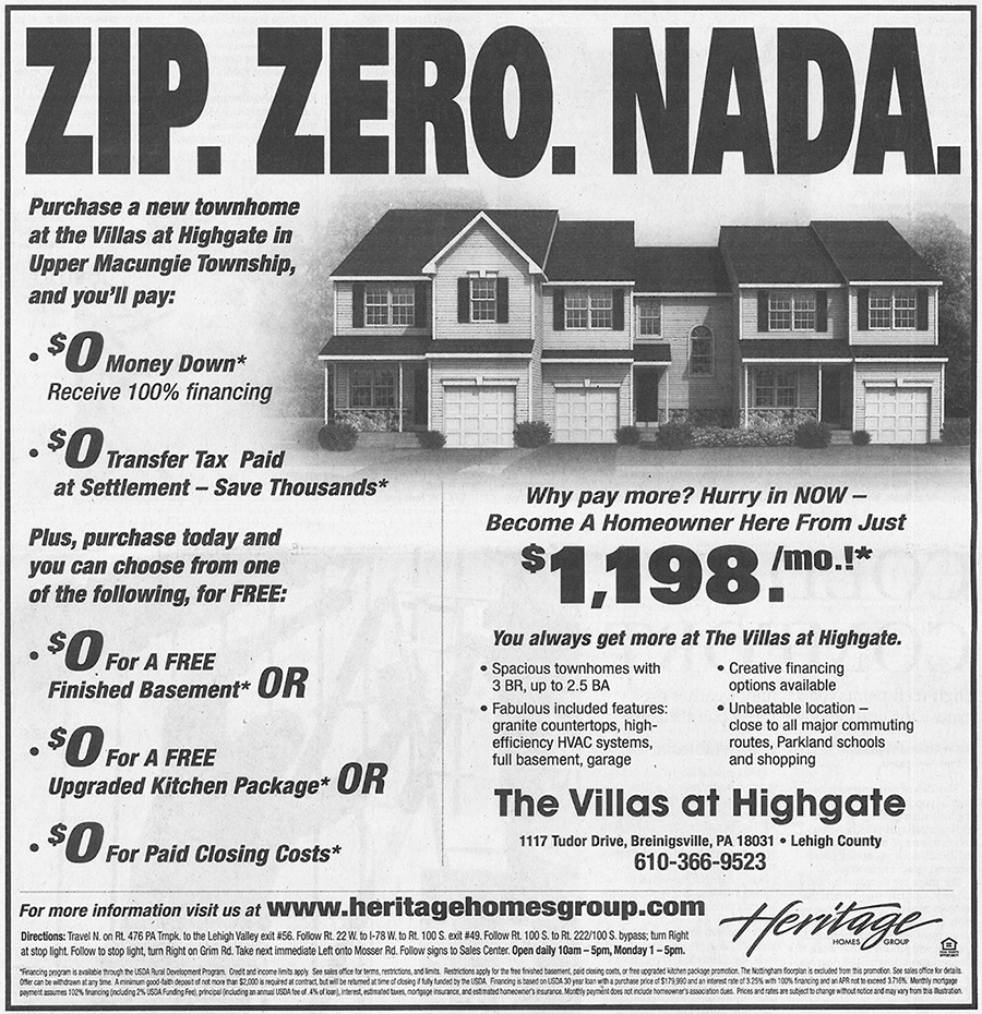 Using the catch phrase "Zip, Zero, Nada," Heritage Homes Group claimed in ads on websites, and in newspapers, flyers, and direct mail, that consumers could finance their homes without a down payment or closing costs. In fact, they were required to pay a “good faith deposit,” settlement costs, and an annual fee, according to the complaint.