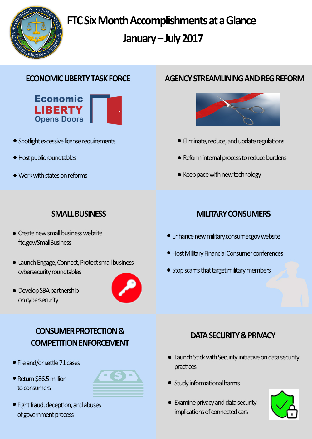 ECONOMIC LIBERTY – Acting Chairman Ohlhausen’s first initiative established an FTC Economic Liberty Task Force to collaborate with state leaders and other stakeholders on occupational licensing reform. The Task Force submitted comments on a state bill to reduce licensing requirements; launched a new website – ftc.gov/econliberty; and conducted dozens of interviews with a variety of stakeholders. The Task Force will hold a public roundtable on July 27, 2017, focusing on license portability, including for the military community, among other issues. “Economic liberty is fundamental to our American way of life and I have spent much of my career advancing it. Unfortunately, too many citizens now need a government permission slip to work,” said Ohlhausen.